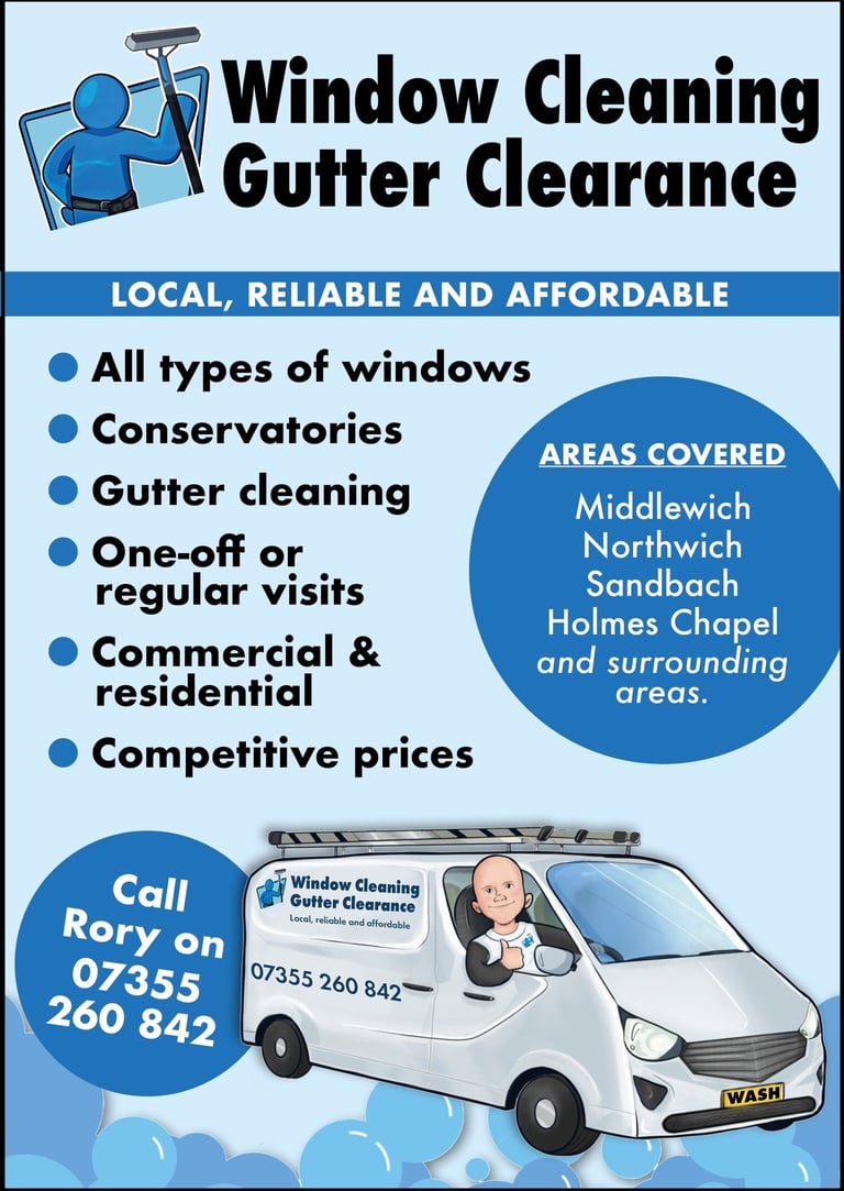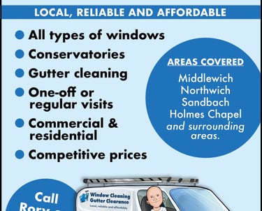 Reliable window cleaning and gutter clearing services in Middlewich, Holmes Chapel, Winsford, Sandbach, and surrounding areas.